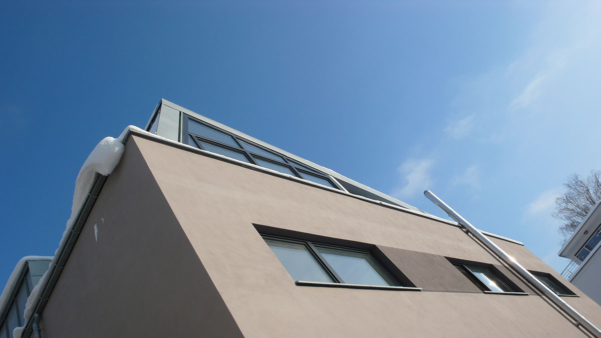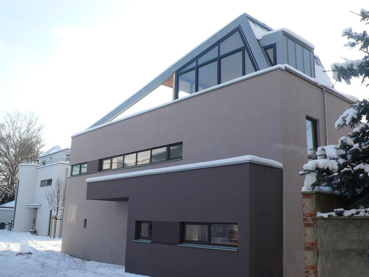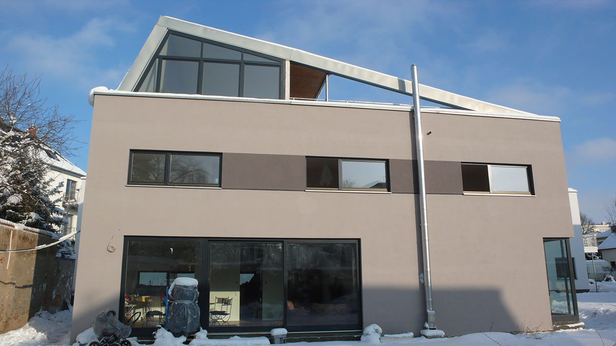Dachdeckung aus Zinkblech. Fenster als Holz-Element-Fenster, Meranti, schwarzgrau gebeizt.
