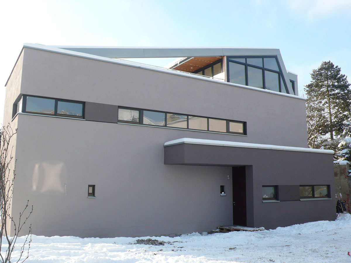 Mischkonstruktion aus Mauerwerk und Stahlbeton; Fassade mit Wärmedämm-Verbundsystem. Dach als Holzkonstruktion mit einer
