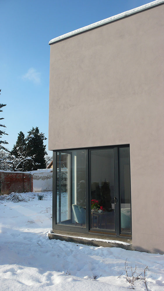 Der schmale Baukörper bildet zusammen mit der alten Gartenmauer eine intime Hofsituation inmitten der innenstädtischen Umgebung des